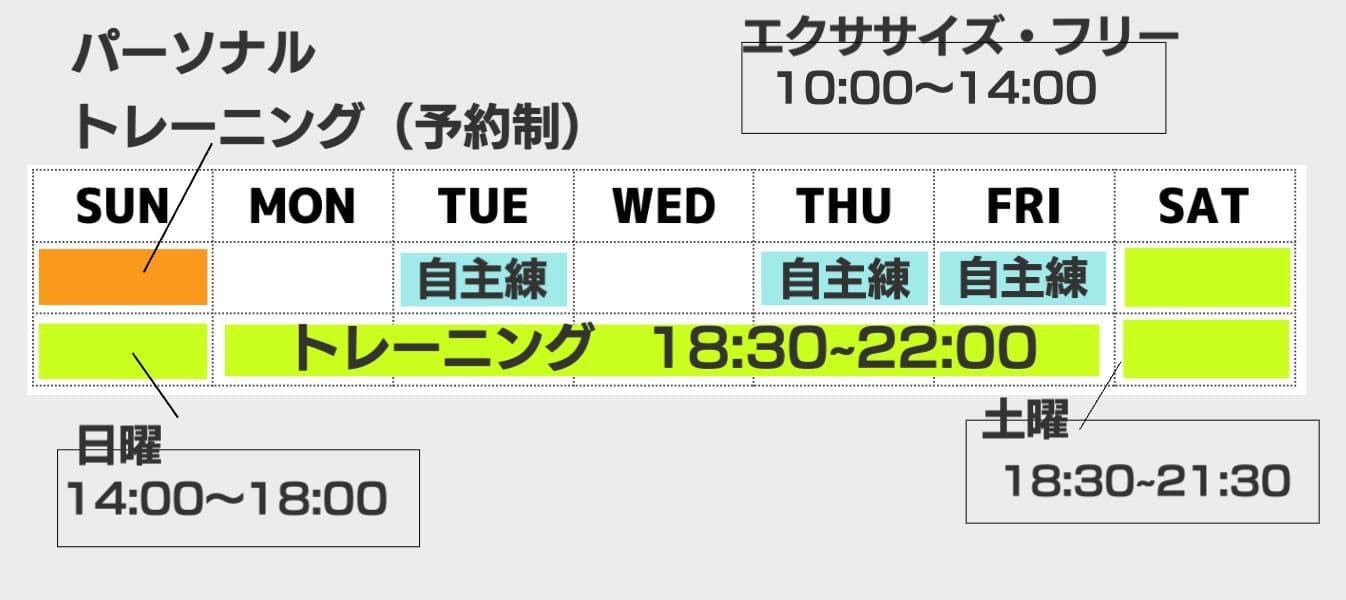 | 営業時間 | 平日 18:30〜22:00 (火・木・金10:00〜14:00(自主練)) 土曜日 18:30〜21:30 日曜日 午前 パーソナルトレーニング(予約制) 午後 14:00〜18:00 |