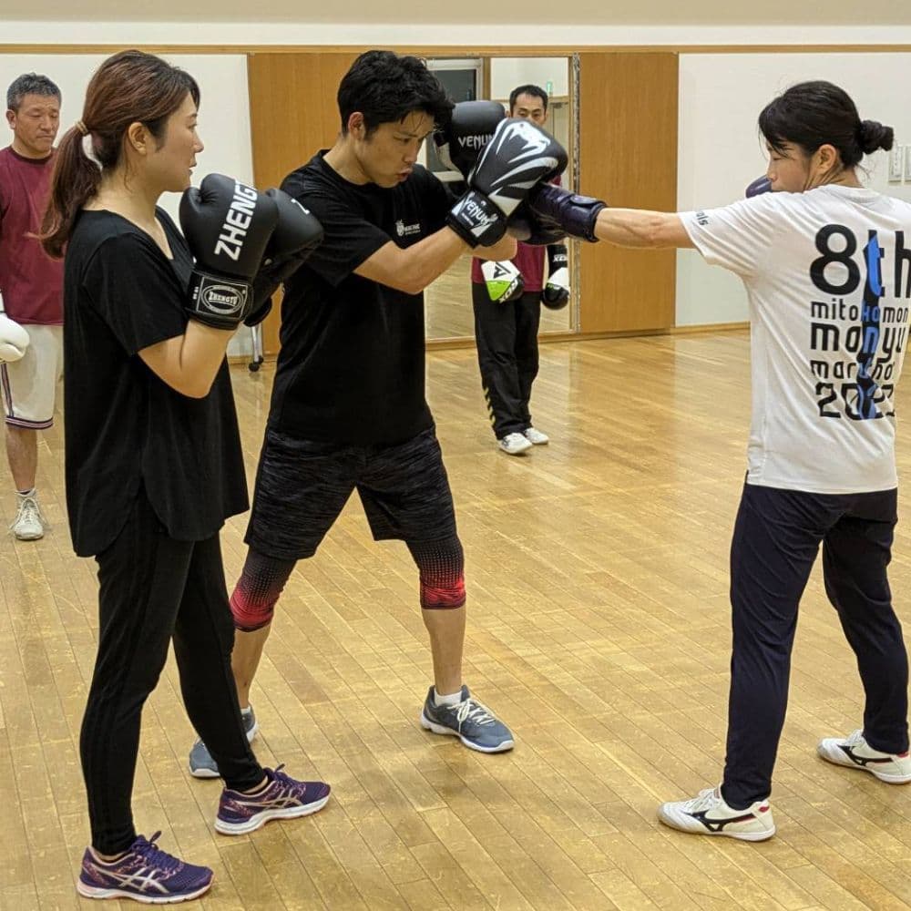 実際に相手と向き合う実戦練習です。ヘッドギア、大きめの14〜16ozのグローブを着用して行い、相手に思い切りパンチを当てることは禁止です。当てることよりも、コンビネーションでの攻撃を念頭において50%くらいの力でお互いに打ち合うトレーニングです。