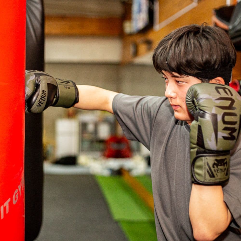 シャドーで作ったフォームやイメージを、実際にサンドバックを叩きながら確かめます。もちろん、叩き方のレクチャーもします。また、連続してサンドバックを叩くことが、体力向上に繋がります。